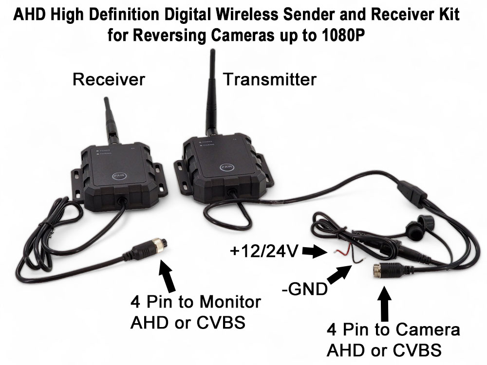 To use these boxes simply plug the receiver into the 4 pin socket of your monitor, the monitor will power the receiver. Then plug your camera into the transmitter box and provide power and Earth using the wire provided. The transmitter will provide power to the reversing camera. For the best experience we recommend using both AHD monitors and AHD rear view cameras. Although these boxes do work with traditional cvbs inputs, we find the performance is not as good as boxes dedicated to the older technology.