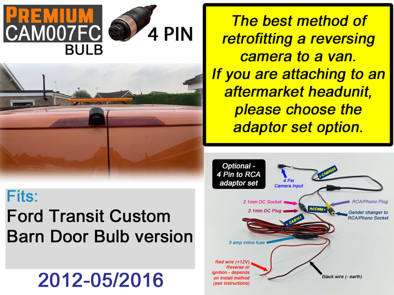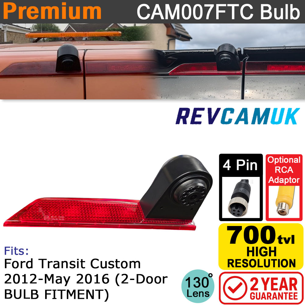 This CVBS version of the CAM007FTC Bulb brake light reversing camera is designed as a direct-fit replacement for the upper brake light on Ford Transit Custom vans from 2012 to approximately May 2016 that use the earlier bulb-type brake light assembly. Once fitted, it keeps a tidy factory appearance while adding a clear and reliable reversing view that works with the vast majority of aftermarket systems.