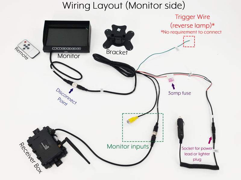 • Just one power connection is required to the monitor wiring – this will power both monitor and receiver box.