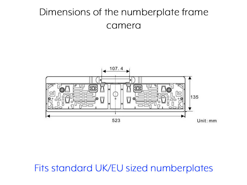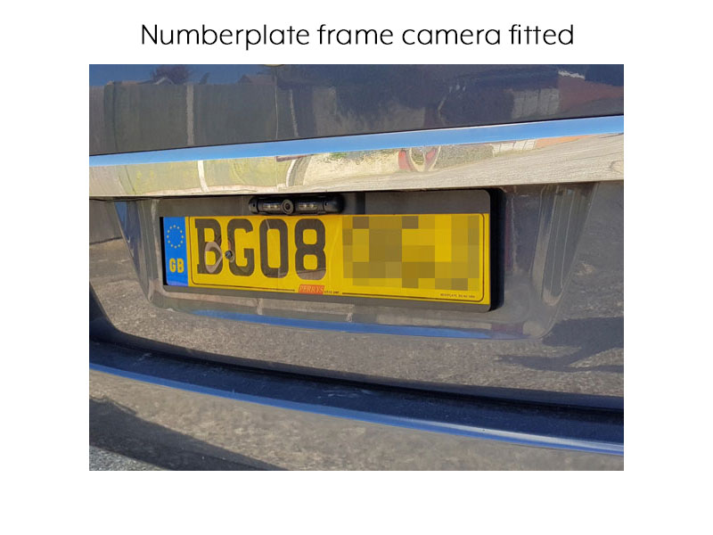 - This kit is supplied with a numberplate frame camera. This camera is fitted with lots of holes (see images). Simply place your standard UK or EU sized numberplate in to the frame, the old numberplate screws will fit through the holes in the frame, which will allow the numberplate/frame camera to be held using the original fixings.
