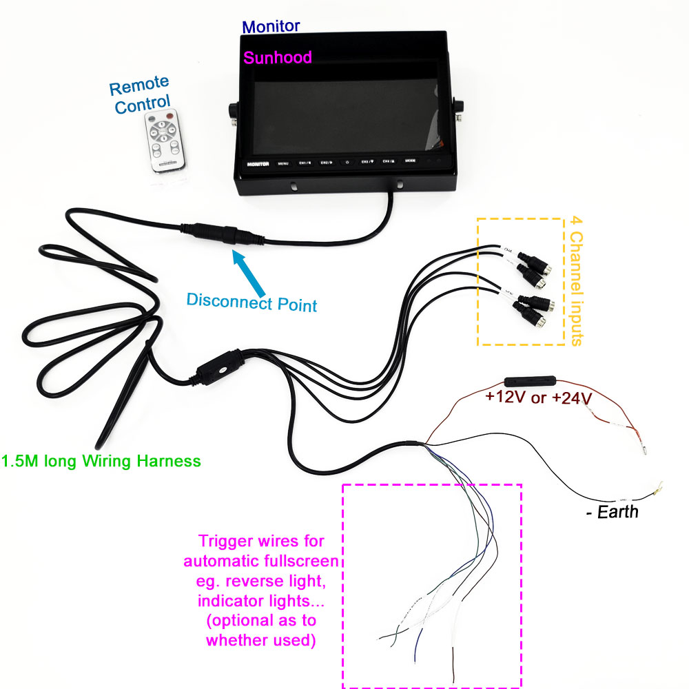• 4x trigger wire – to auto change channel when a trigger occurs eg selecting reverse gear, indicating left/right etc.