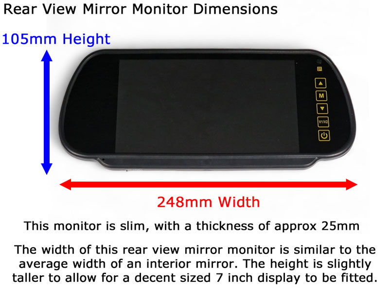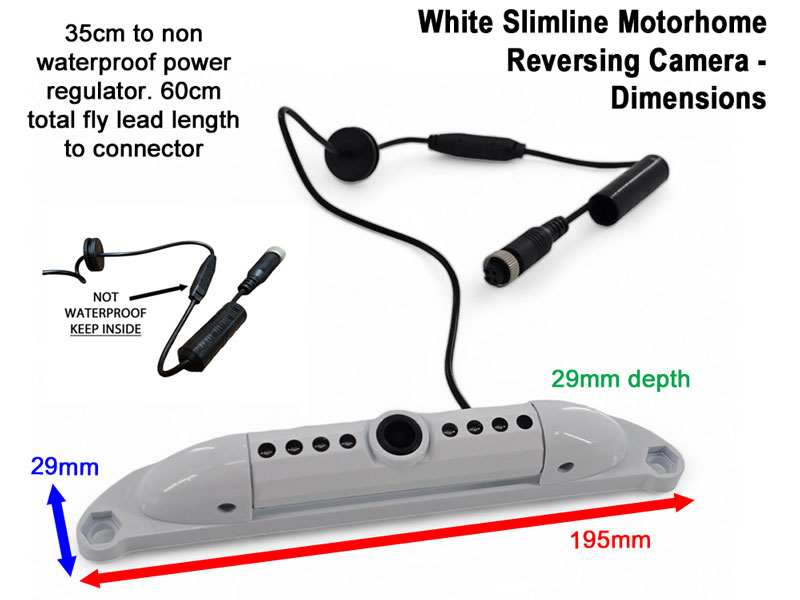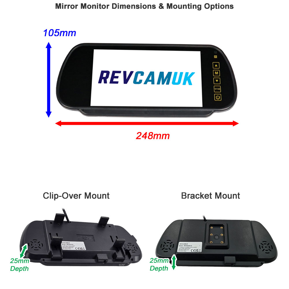 - Reversing camera kit with a white slimline camera and a 7 inch mirror monitor (choice of clip-over type or bracket to windscreen mounting plate type).