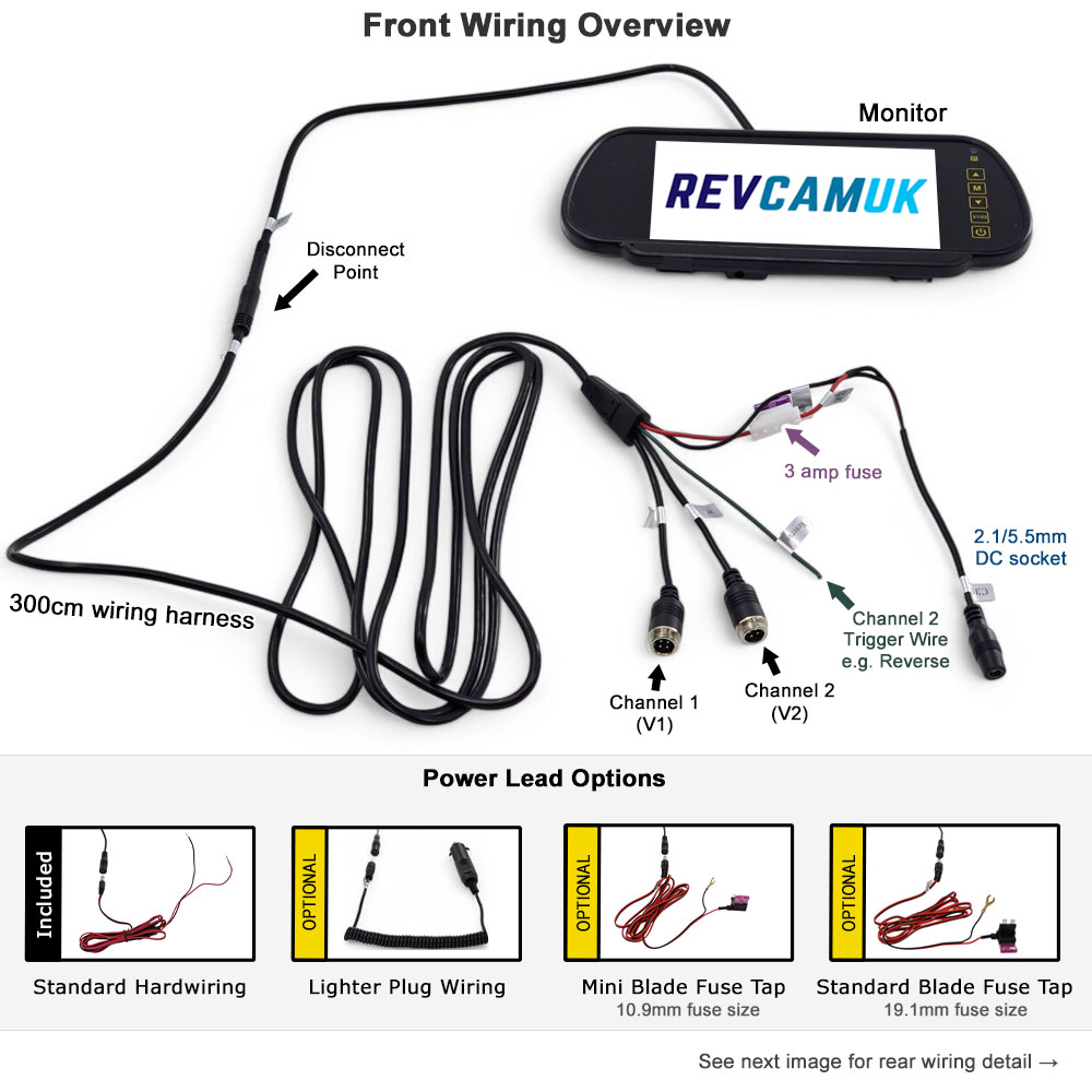 - On the monitor wiring harness is a 2.1mm DC socket. On the drop down menu of this product, you can select your desired power lead to plug in to this.