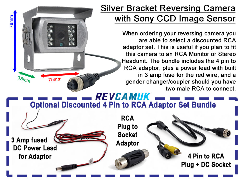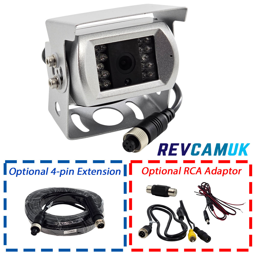 Our Silver Painted Stainless Steel Bracket Reversing Camera is fitted with a Sony 1/3″ CCD 700tvl image sensor for a great, colourful, high-resolution image. Fitted with 18 IR LEDs and with the Sony 811’s great low-light level sensitivity, this camera has excellent night vision. The camera has a built in microphone, if your monitor has a speaker, you can hear the surroundings close to the camera. Thanks to the painted stainless steel bracket, an excellent rust-resistant material, there are no worries regarding rusty brackets. 4 Pin waterproof screw locking connector cable, with the option to add one of our RCA adaptor bundle sets should you have an RCA Monitor or are fitting to a Stereo head unit.