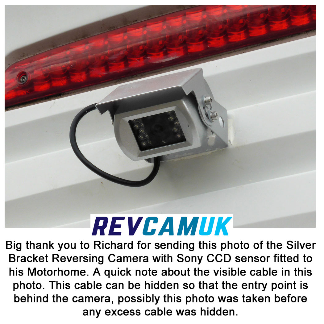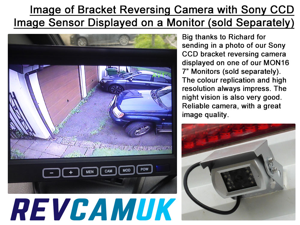 • Flexible Mounting Bracket – Bracket cameras remain one of the most popular types for mounting on vehicles as a reversing camera. They are easy to fit and can be mounted in a position of your choice. Most commonly, these are mounted higher up, sometimes on a rear vertical wall, e.g. on the back of a Motorhome or Van, and sometimes on a horizontal surface, e.g. on the top of a door/roof.