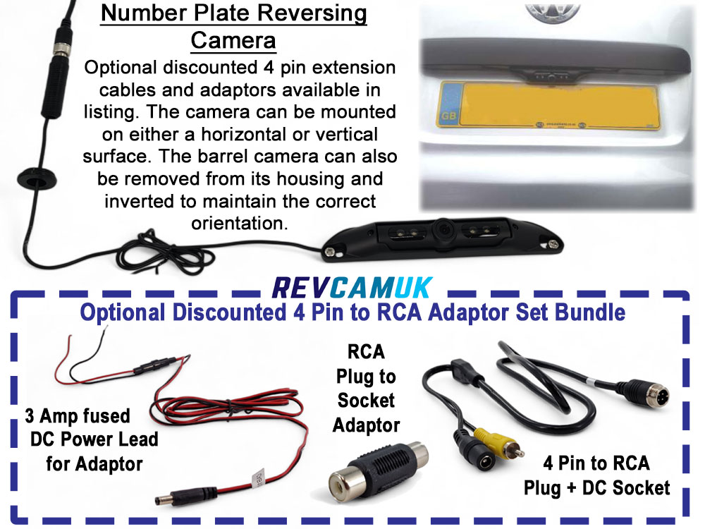4 Pin Connector / Optional RCA Phono Adaptors – The camera uses the most popular 4 pin screw connector to take Video Signal, Audio from the microphone, and Power. Should you wish to convert this to RCA Phono Connection e.g. for an RCA Monitor or Stereo Headunit e.g. Sony/Kenwood/Pioneer you can order a discounted bundle set which has our 4 pin to RCA Adaptor + Power Wire with inline fuse + RCA Coupler.