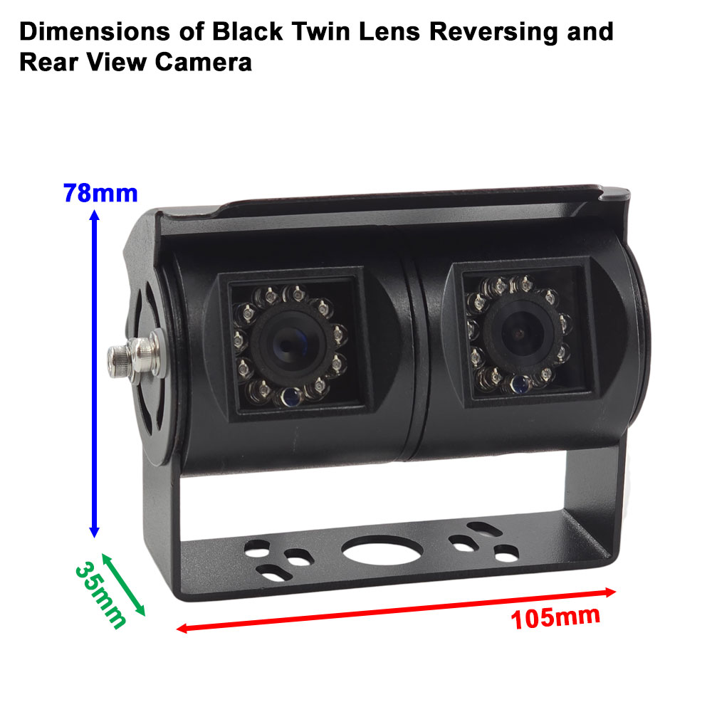 This is our high-definition twin-lens AHD reversing and rear-view camera designed for motorhomes, large vans, HGVs and other longer vehicles that need both a wide angle reversing view and a realistic rear-view driving image. Inside the black-painted stainless steel bracket are two separate cameras: a wide-angle reversing lens for close-up parking and hitching, and a narrower rear-view driving lens that provides a more natural sense of distance without an exaggerated fisheye effect. Both lenses output a 1080P AHD signal based on the Sony IMX307 1/2.8″ image sensor, providing a sharp, detailed picture. The camera connects via 2x 4-pin aviation connectors. A dedicated twin signal lead is available in a choice of lengths, with selected lengths offering an 8 mm disconnect joint to help with routing through any tight gaps. This model must be used with a 1080P compatible AHD monitor and is supplied with our two-year Reversing Cameras UK guarantee.