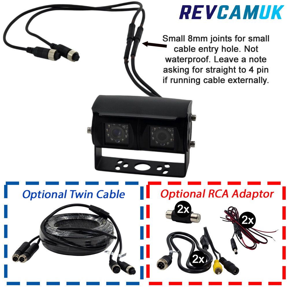 4-Pin Aviation Connector and Twin-Lens Extension Cable Options – The camera connects via two industry-standard 4-pin aviation connectors, which can be connected to an optional dedicated twin-lens cable that carries both video feeds and power. It provides a secure, vibration-resistant link that installers and auto electricians prefer, and works seamlessly with our AHD monitors and adaptor sets.
