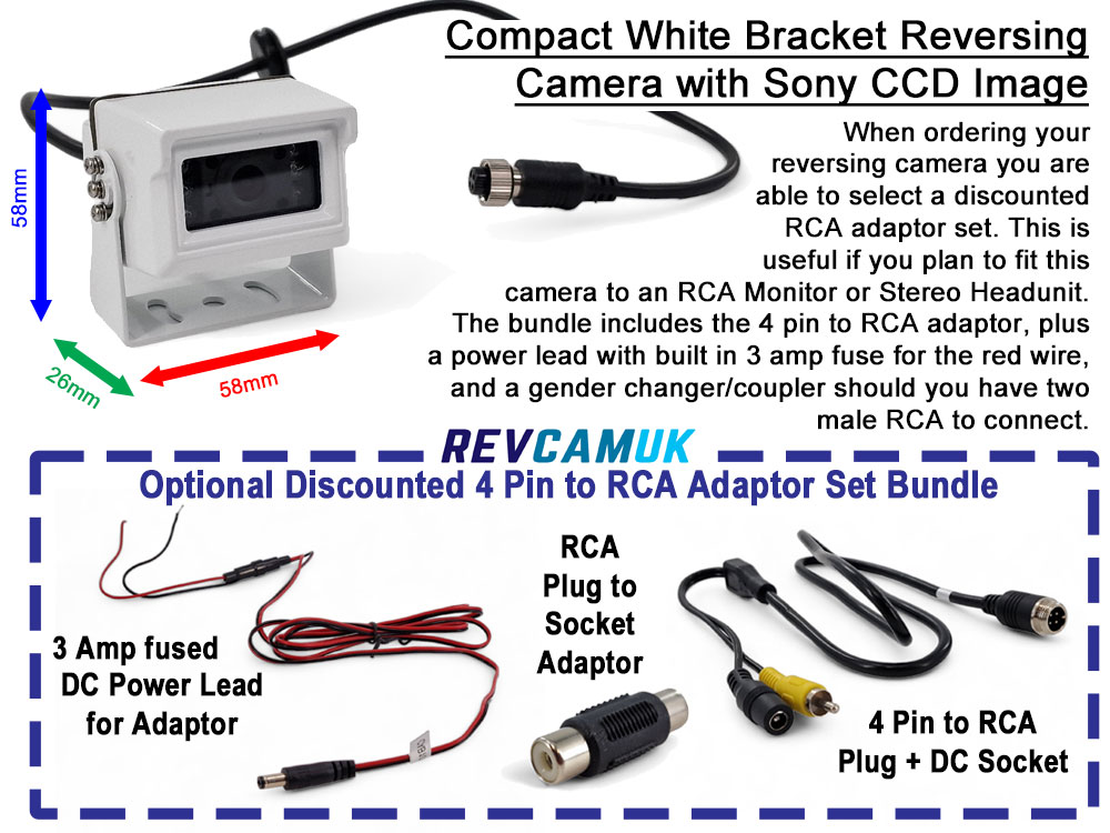 An optional discounted 4-pin to RCA adaptor is available if you need to connect this camera to an RCA-based monitor or stereo head unit. This adaptor can be useful in two scenarios:
