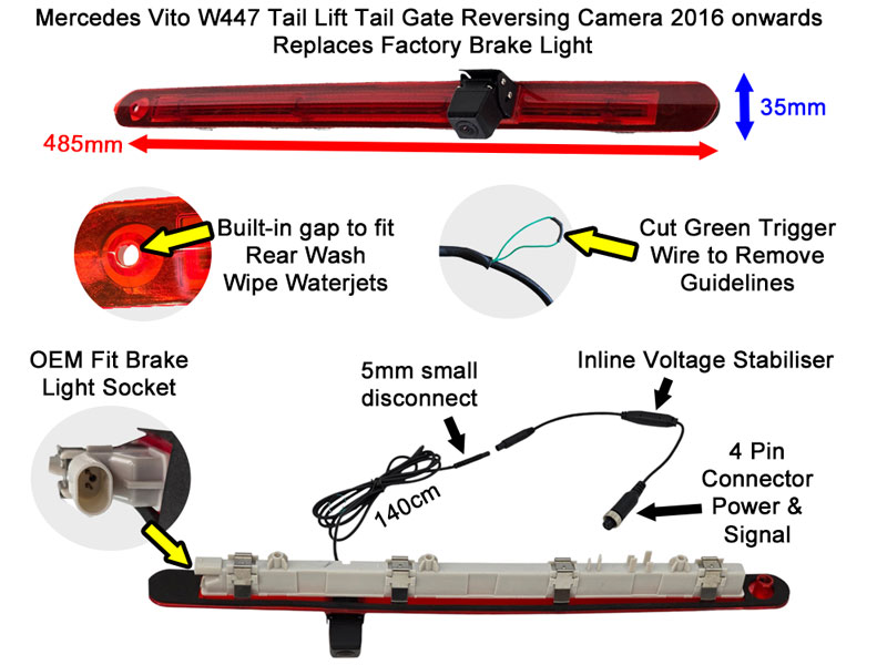 This brake light reversing camera is designed as a direct, vehicle-specific replacement for the original upper brake light on Mercedes Vito W447 tailgate models built from 2016 onwards. It fits in the factory position to retain a tidy OEM appearance while adding a clear, dependable reverse image that works with the vast majority of aftermarket monitors and head units.