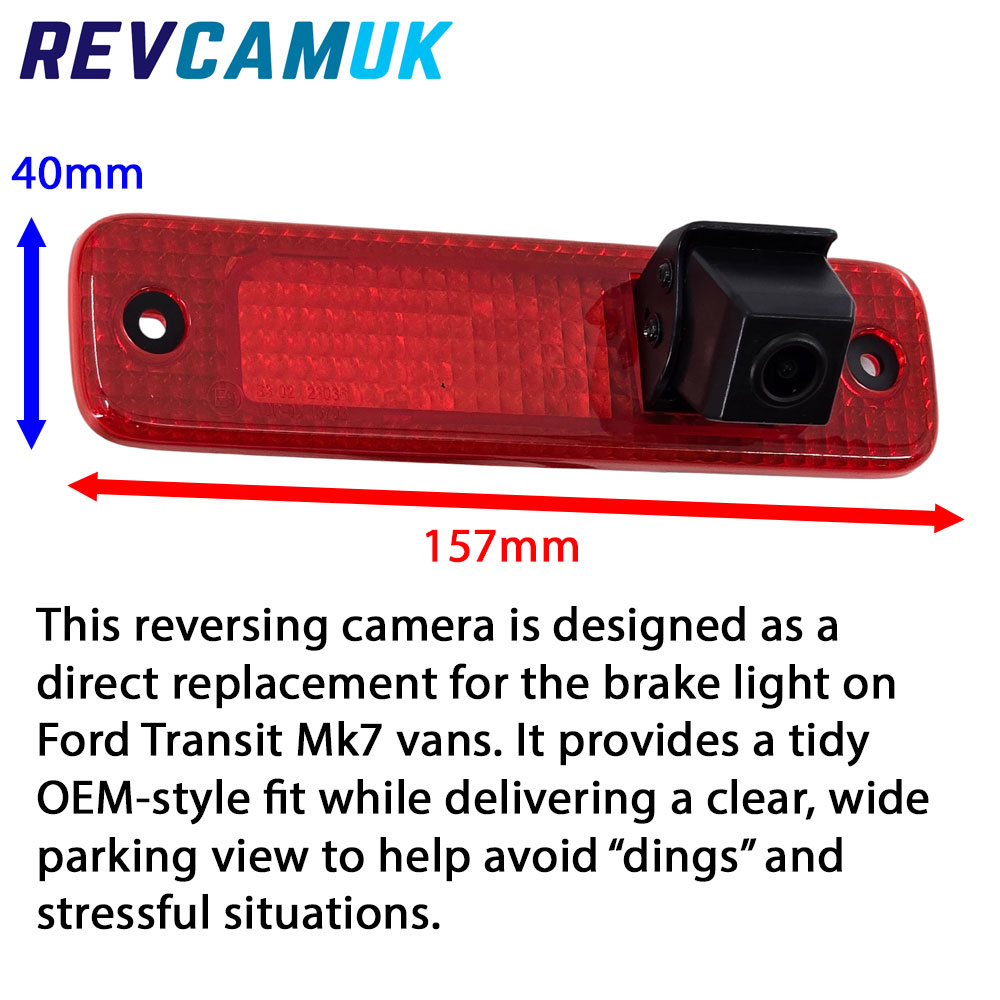 This brake light reversing camera is designed specifically for the Ford Transit Mk7 (2006 – 2013). It replaces the original high-level brake light with a purpose-built housing that integrates a reversing camera, retaining a tidy factory-fitted appearance while adding a clear and reliable reverse view.