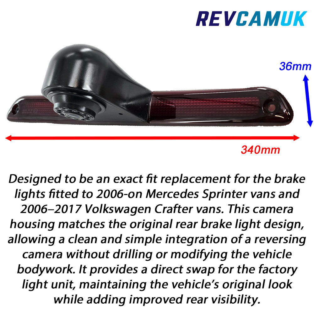 This brake light camera is designed as a factory-style replacement for Mercedes Sprinter (2006–present) and Volkswagen Crafter (2006–2017). It replaces the upper brake light with an OEM-style housing that integrates a reversing camera, giving a tidy appearance while adding a clear and reliable parking view.