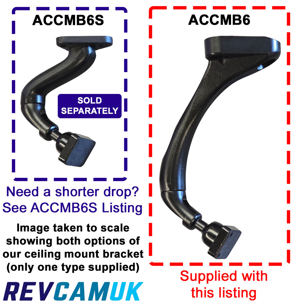 The ACCMB6 is a universal ceiling-mounted swan-neck bracket designed to hold any of our bracket-style mirror monitors securely in place. It attaches directly to the interior ceiling surface, providing a stable and elevated mounting point ideal for vans, motorhomes, trucks, HGV cabs and other custom installs. Screws are included to attach the bracket firmly to the rear of compatible mirror monitors.