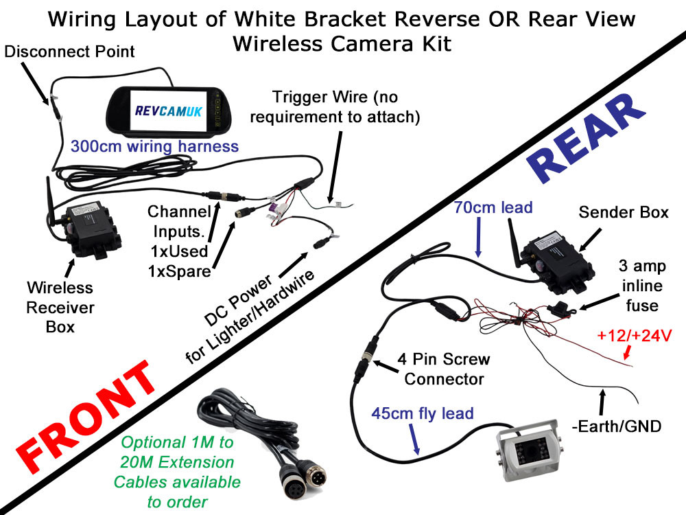 Wireless cameras used to have a bad reputation and this stems from the old analogue wireless, full of static and restricted in Europe to just 10mW transmitting power. These premium wireless cameras use a completely different way of transmitting and receiving data that stops the old problems from happening. They pair up and digitally talk to each other almost like a Wi-fi connection. The range is much, much greater and can be used on the longest of vehicles. This system is modular which means if you wanted to add a cabled version with it then you can, also you can use our 4 pin extension cables to put the transmitter box further away from the camera.