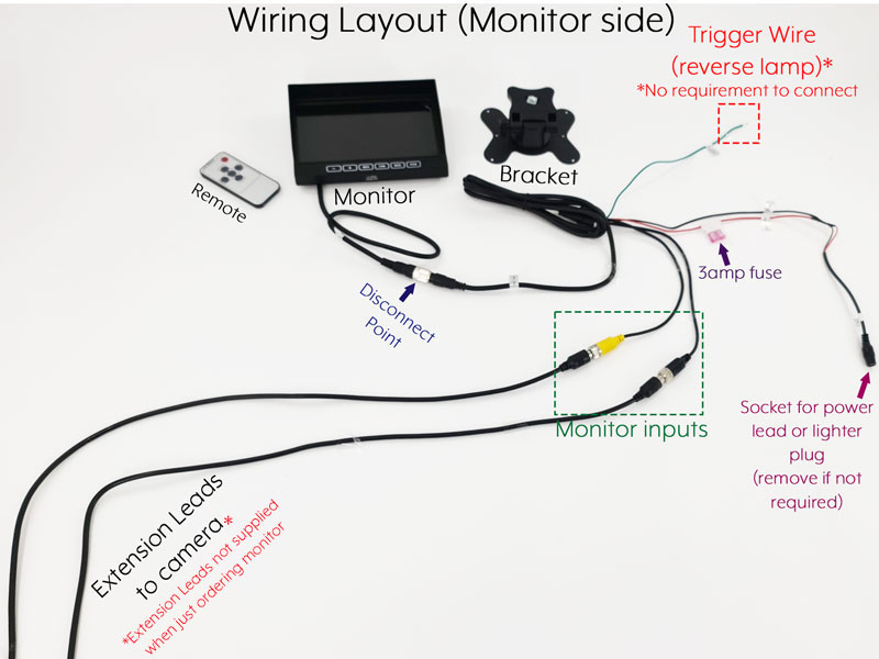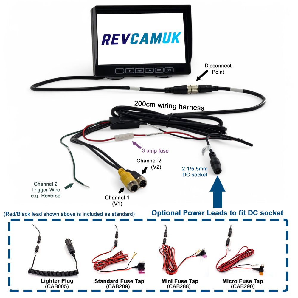 The monitor has a fly lead to an 8 pin connector, this then connects to a 2M long wiring harness that on the other end has 2x 4 pin aviation connector inputs, as well as a reverse light trigger wire and power socket. We provide as standard a power lead for this socket that terminates in a red/black bare wire. Optional lighter plug and fuse tap leads are available using drop down menu for power options.
