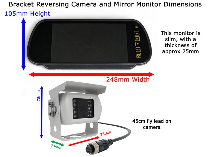 - The reversing camera kit + additional camera comes with a rear view mirror monitor display, which is fitted with a 7″ LCD panel. This monitor secures itself to the existing interior mirror with strong, spring-loaded grips.