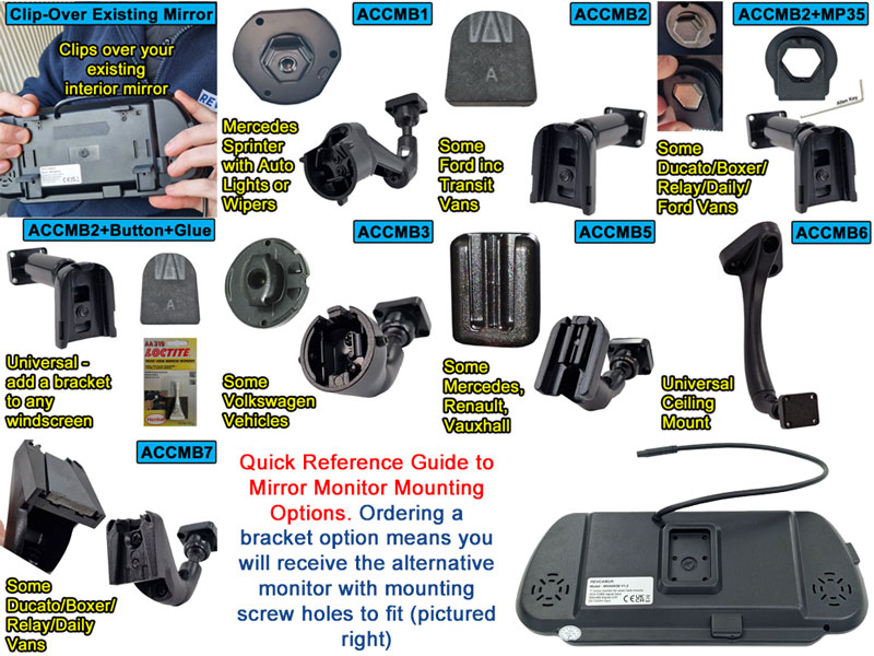 For many years we have supplied the universal clip-over existing interior mirror rear-view monitor. More recently we have also begun to offer the monitor with a variety of direct-to-windscreen stalk brackets. We have windscreen brackets to fit the most popular van and motorhome models, as well as a universal option where you can glue a mounting plate to the windscreen for a bracket to fit. See our guide below for more information about the different bracket options.