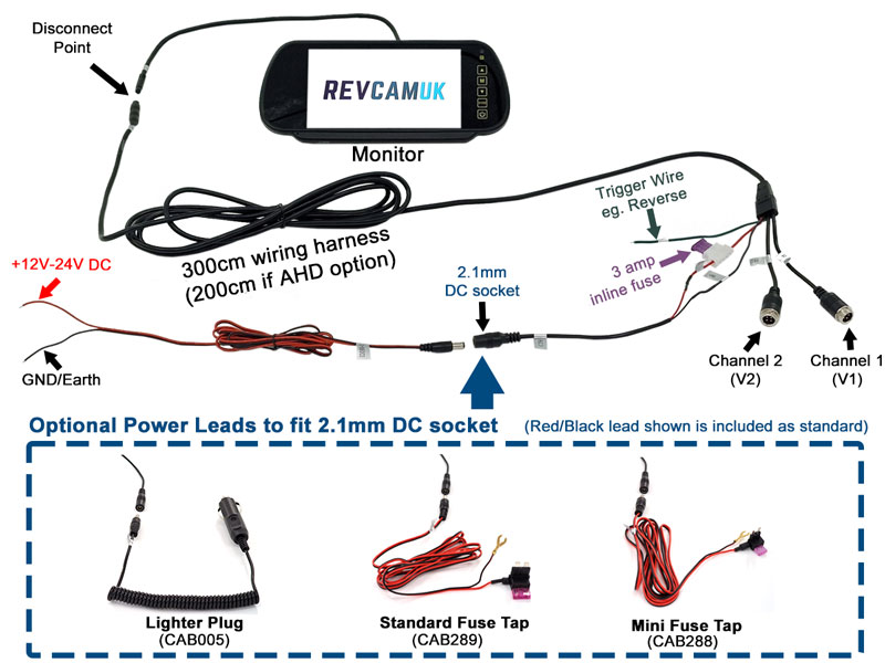 - On the monitor wiring harness is a 2.1mm DC socket. On the drop down menu of this product, you can select your desired power lead to plug in to this.
