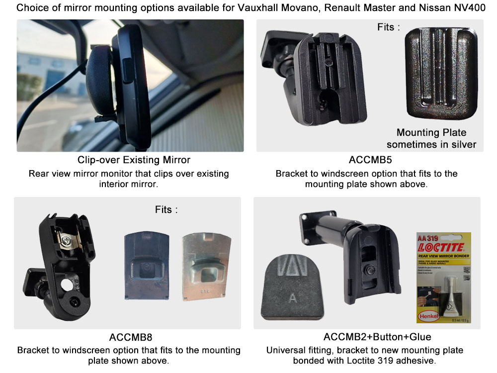 We stock two types of mirror monitor depending on how you would like to mount the display. The default option is the clip-over mirror monitor, which is fitted with strong spring-loaded clamps that attach securely to an existing interior mirror. The second has screw holes on the rear, which can fit to our direct-to-windscreen swan neck bracket attachments. See the choice options below :