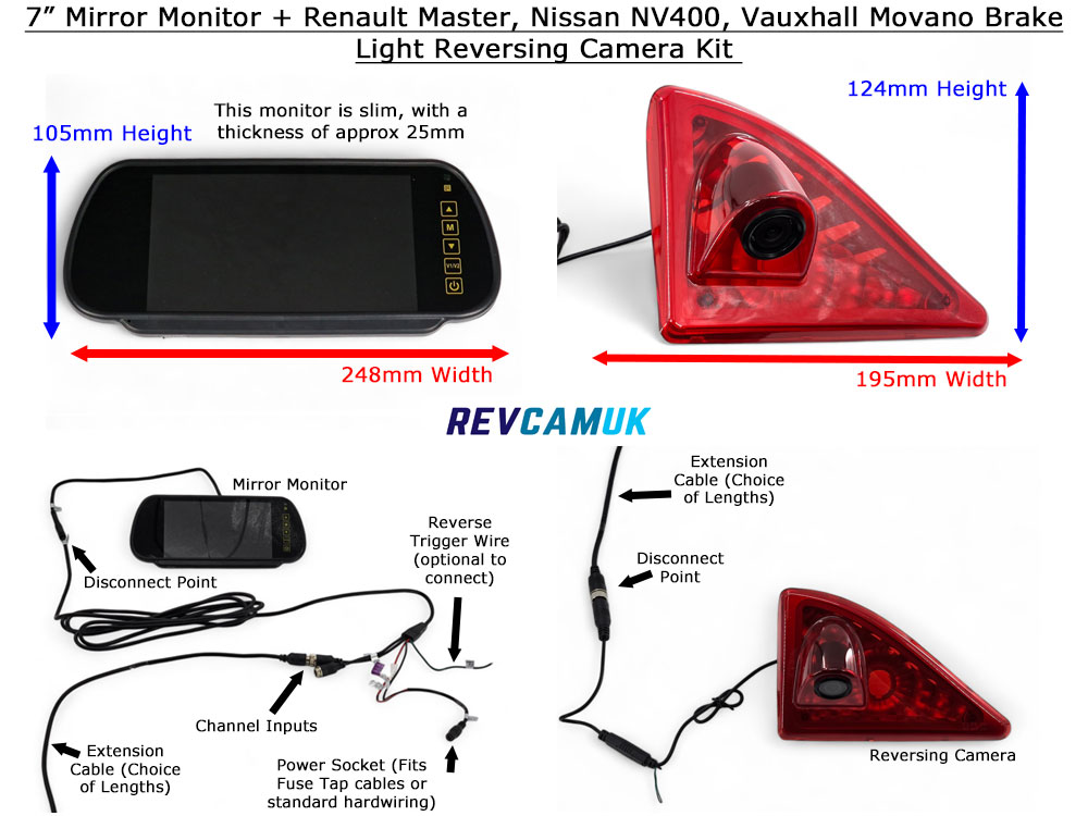 Brake light reversing camera kit to fit Renault Master 2010-Present, Nissan NV400 2010-Present, Vauxhall Movano 2010-2022 vans. Comes with our top quality 7″ rear view mirror monitor display, optional fitting brackets or clip-over original mirror, two year guarantee, lifetime support, 4089 700tvl image sensor, night vision, factory-fit appearance, quick dispatch, and all the service and support you expect from Reversing Cameras UK Ltd.
