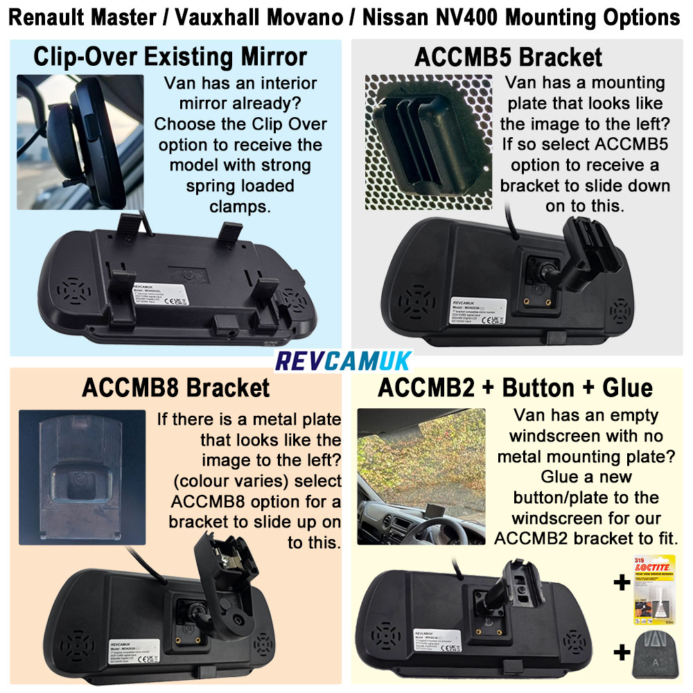 We stock a number of different mounting options for the mirror monitor, depending on what you currently have fitted to your van. Please check the options below, and select the one that you require from the drop down menu above.