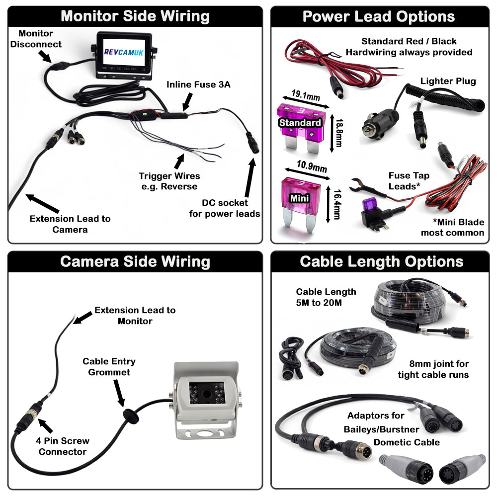 Cable length is 12.5 metres as standard, but you can select from 3 metres up to 20 metres depending on your vehicle and cable route. Some lengths are available with a small 8mm-diameter disconnect joint, designed to help you feed the cable through tighter gaps before rejoining to the standard 4-pin connector. Choose from optional power lead choices, including a 12V lighter plug (handy for testing) or piggyback fuse holder taps for a tidy hardwire install. The heavy-duty U-bracket is always included for the monitor, and you can add alternative mounting brackets if you’d like a different mounting position. See detailed images for more information about options.