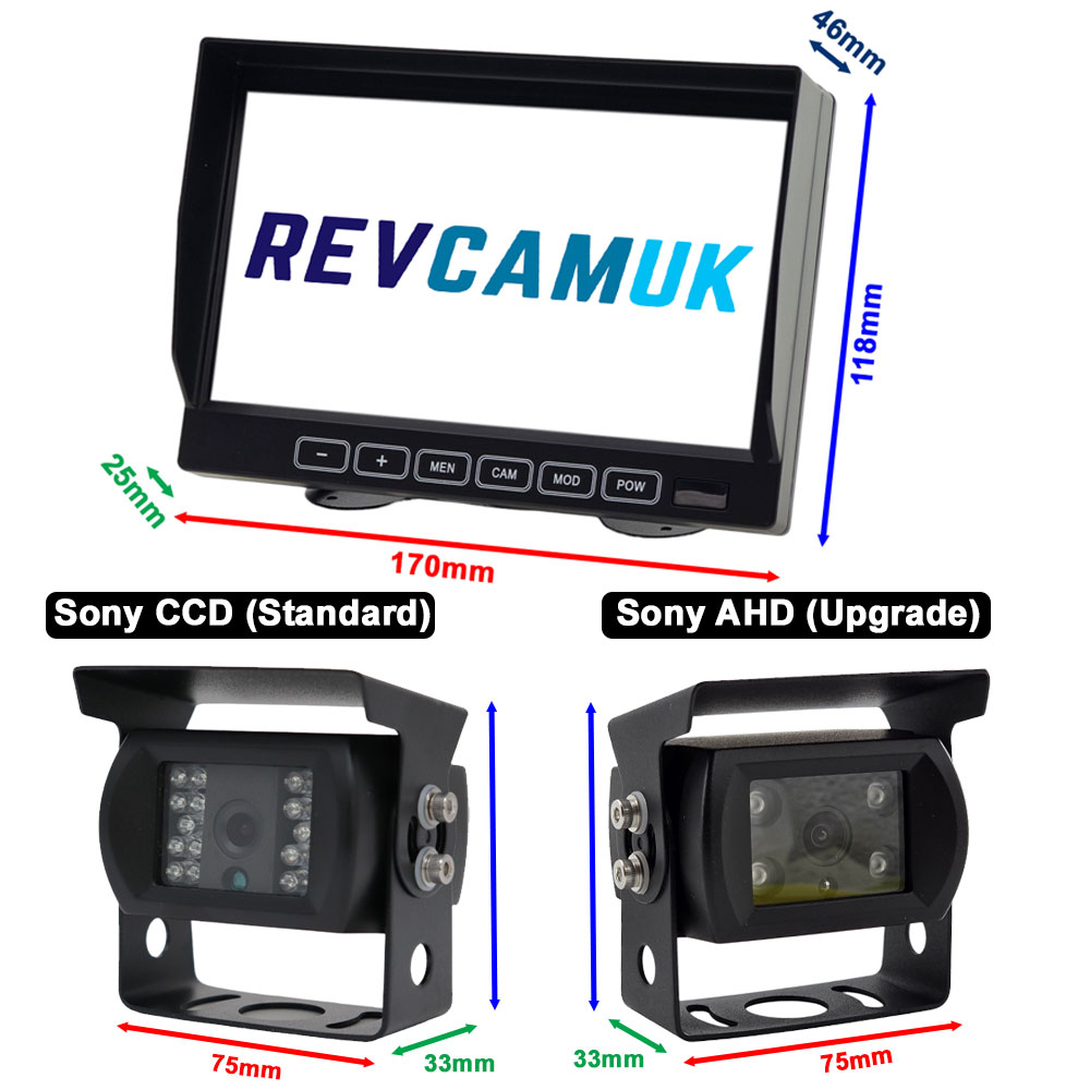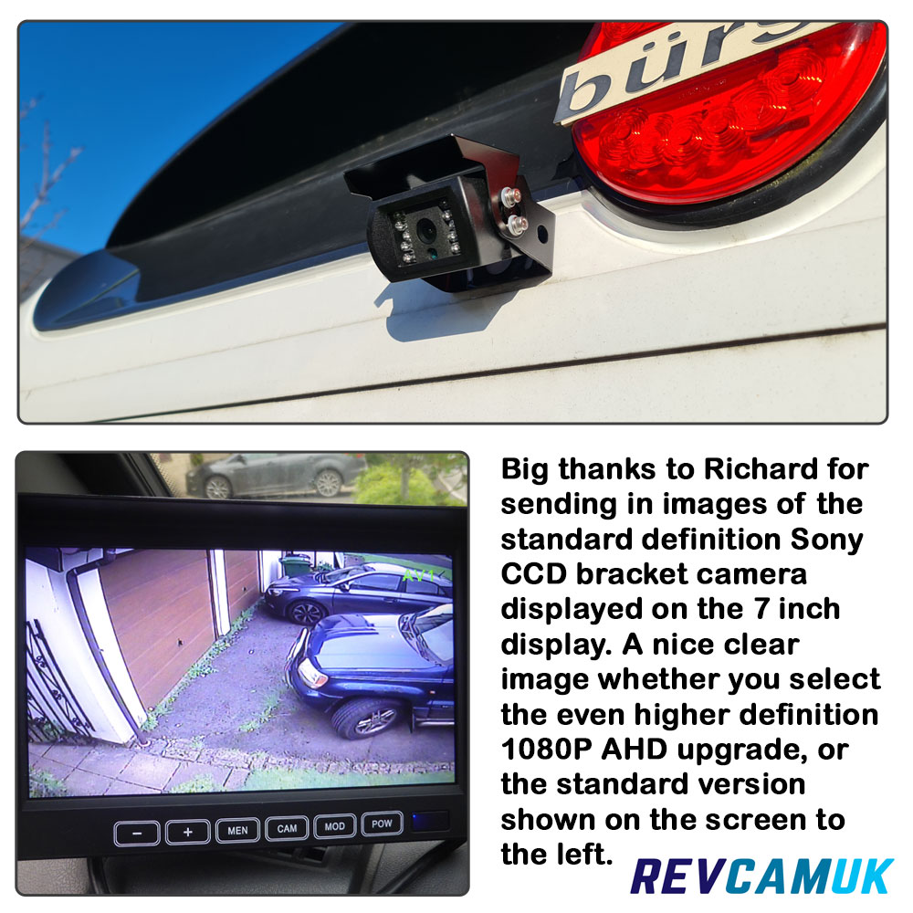 A premium reversing camera kit designed for vans, motorhomes, and HGVs. It pairs a 7-inch dash-mounted display with a high-quality black-painted stainless-steel bracket camera using a Sony image sensor for excellent image quality. Customers can choose between a 120° wide-angle lens for reversing or a 60° narrow-angle lens for constant rear-view driving. An optional AHD 1080P upgrade is also available for higher definition and even more vibrant colours.