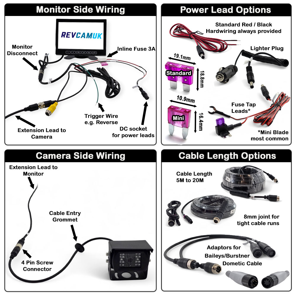 Easy installation: All-in-one screw locking cable powers the camera directly from the monitor, avoiding CANBUS errors common with traditional reverse-light wiring. Optional lighter plug and fuse tap adaptors are also available.