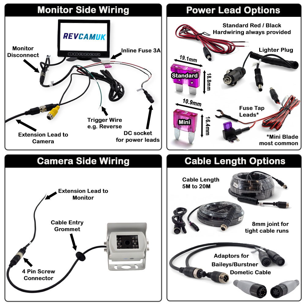 Easy installation: All-in-one aviation cable powers the camera directly from the monitor, avoiding CANBUS errors common with traditional reverse-light wiring. Optional lighter plug and fuse tap adaptors are also available.