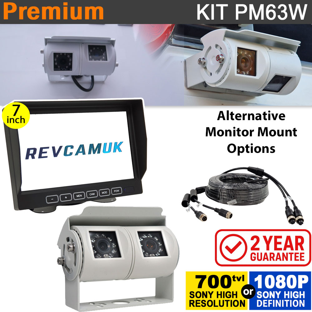 The PM63W is a twin-lens reversing and driving camera system designed for vans, motorhomes, and HGVs. It combines a 7-inch dash-mounted display with a white stainless-steel bracket camera that offers both a 120° wide-angle reversing view and a 45° rear-view driving perspective. Supplied with a Sony CCD 700TVL image sensor as standard, with the option to upgrade to Sony AHD 1080P for sharper definition and more vibrant colours. IP68 rated, stainless steel bracket, and robust build for reliable daily use.