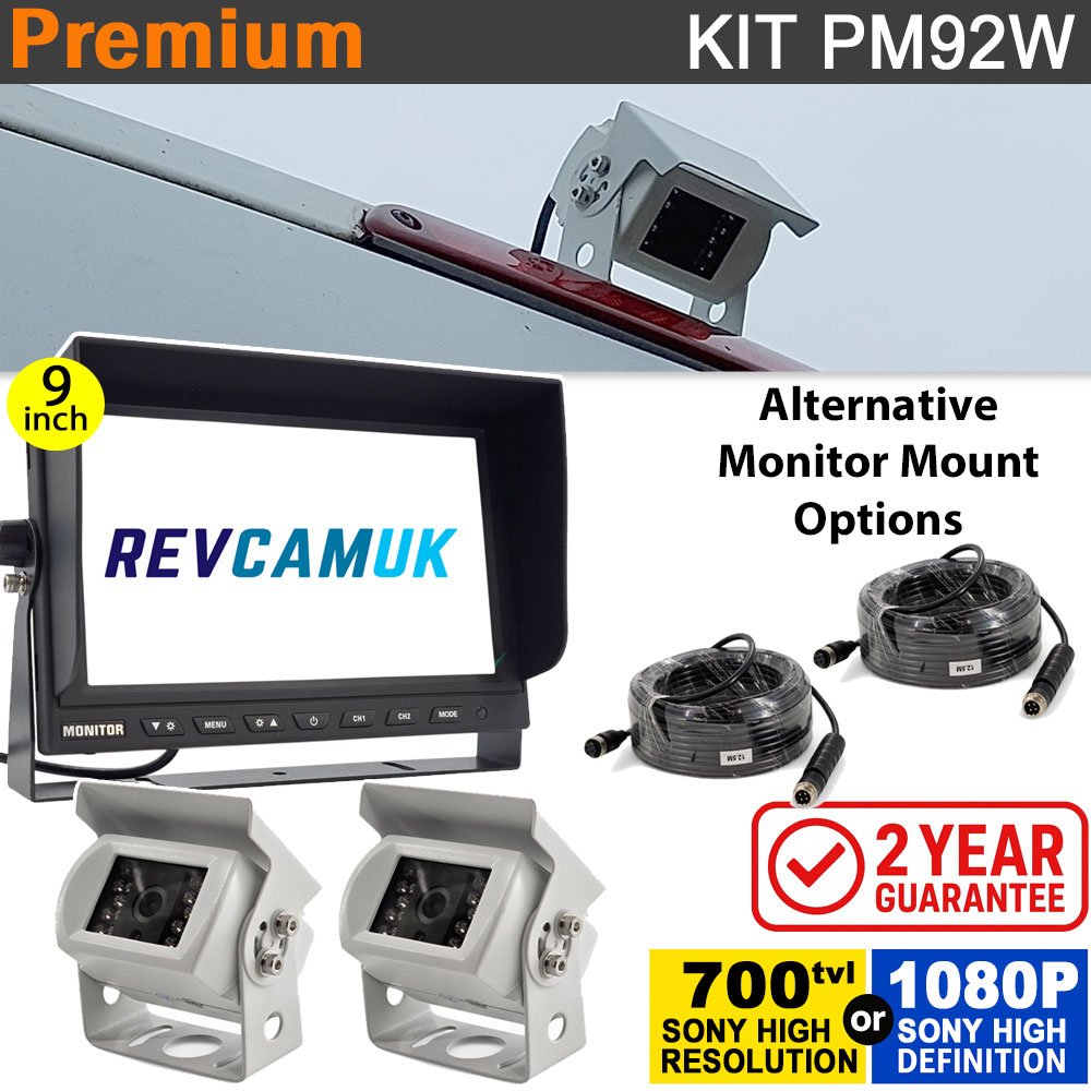 The PM92W is designed for vehicles that need two views at once. It pairs a 9-inch heavy-duty dash monitor with two matching white stainless-steel bracket cameras. Available with standard Sony CCD or the optional Sony AHD 1080P upgrade, the system provides a clear rear road view plus a second area such as a horsebox ramp, trailer hitch, or agricultural implement. Built to withstand long cable runs, all-weather conditions, and daily use.
