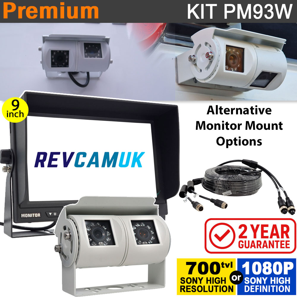 The PM93W is a premium reversing and rear-view camera kit designed for larger vehicles, motorhomes, and HGVs. It combines a heavy-duty 9-inch dash-mounted monitor with a twin-lens white bracket camera, giving you both a 120° wide reversing view and a 45° narrow rear-view driving angle in one housing. Supplied with Sony CCD as standard or the upgraded Sony AHD 1080P option, this system is built for long cable runs, all-weather use, and everyday reliability.