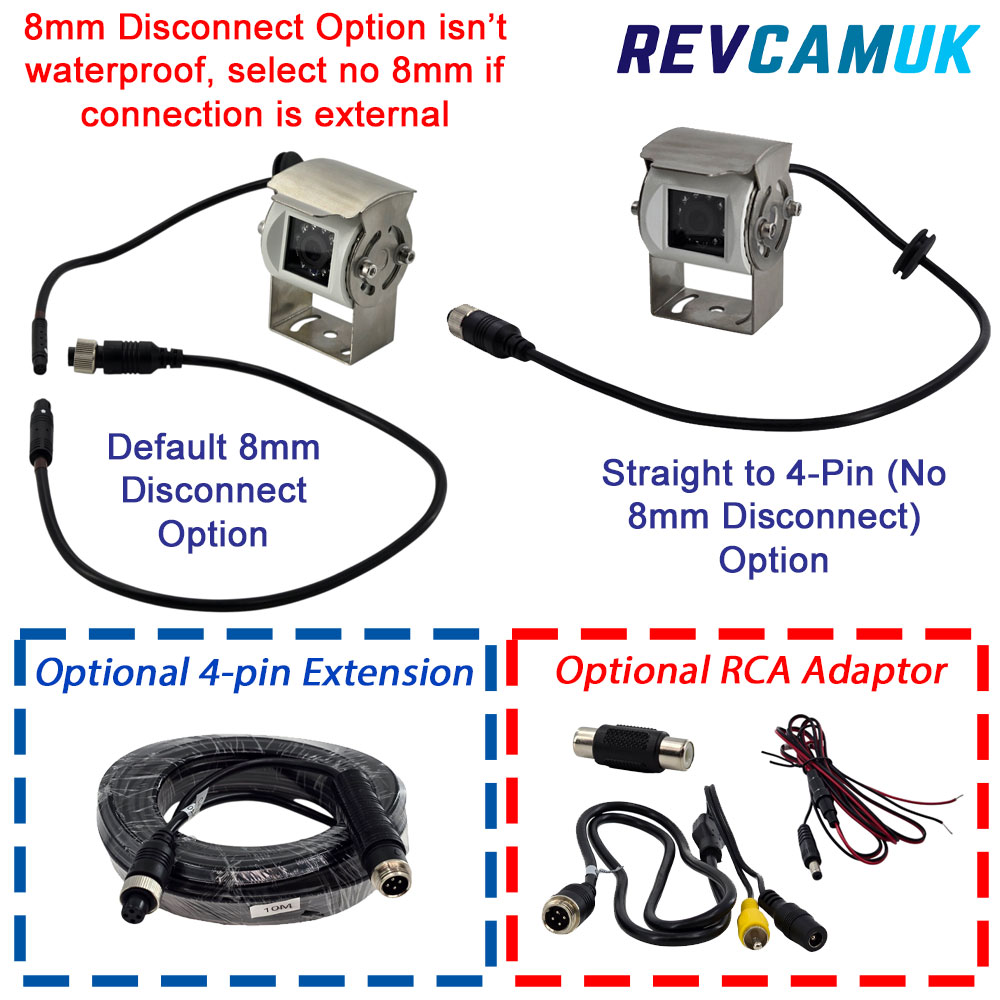 4-Pin Aviation Connector and 8 mm Disconnect – The camera has a short fly lead with a 4-pin screw-type aviation connector, plus a small 8 mm disconnect partway along the fly lead. This smaller joint allows the cable to pass through small holes when bringing it into the vehicle. The 8 mm disconnect is not waterproof and must remain inside. If you need a version without this disconnect, please select the no-8mm version from the camera option drop down menu when ordering.