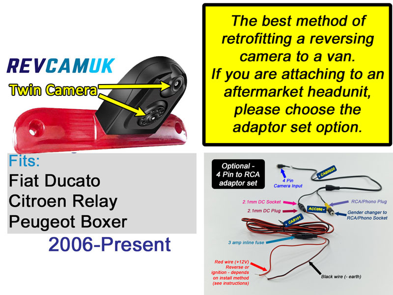 Fitting instructions covering installation of our twin brake light reversing camera / rear view camera fitting to Fiat Ducato, Peugeot Boxer, and Citroen Relay vans.