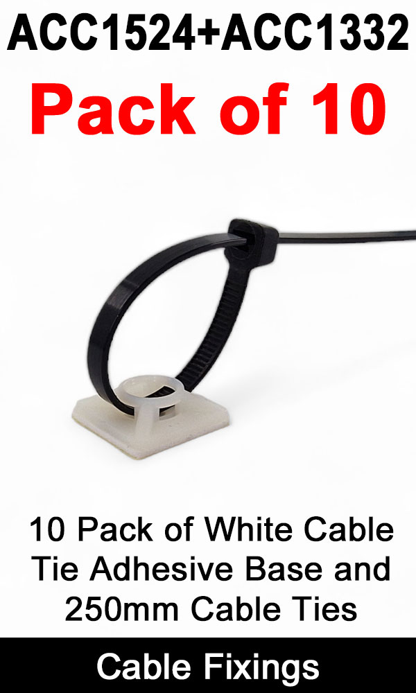 This is a bundle that contains 10 each of the white 19mm x 19mm adhesive cable tie base and 250mm length cable ties. They fit well together.