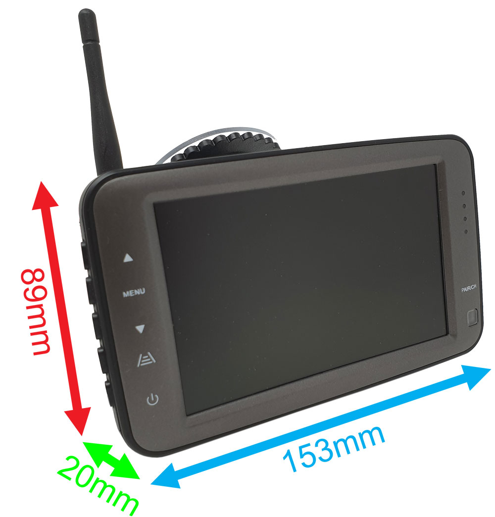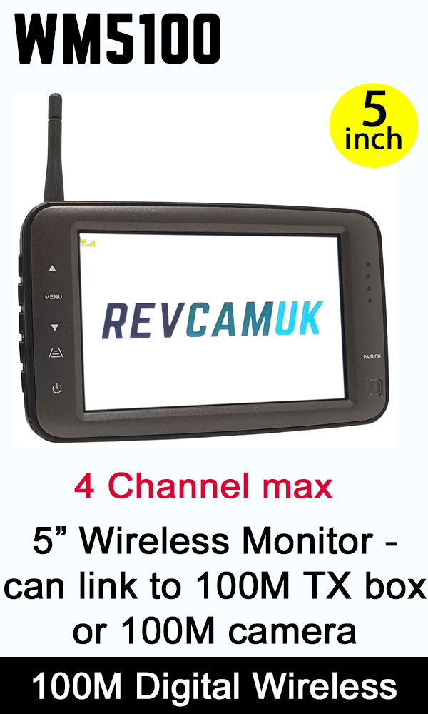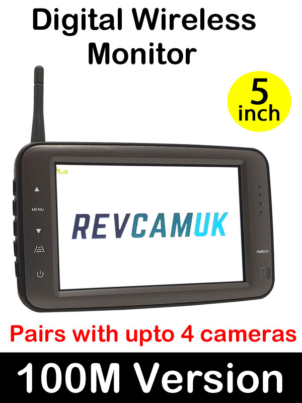This monitor uses the latest digital wireless technology to talk to either a 100M version transmitter with one of our regular 4 pin cameras, or one of the 100M version wireless cameras with the integrated aerial.
